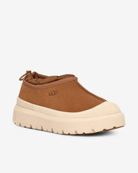 Who (and we can't stress this enough) wants to take a walk in the drizzle with us? We can always count on our Tasman Weather Hybrid to travel with us outdoors, even if its a little wet out there. Featuring waterproof suede and seam-sealed construction as well as our cozy UGGplush™ upcycled wool lining, our Tasman Weather Hybrid offers a light, slipper feel with an easy slip-on silhouette. The outsole is made from renewable, rainwater-nourished sugarcane and features a permanent galosh for wet conditions.